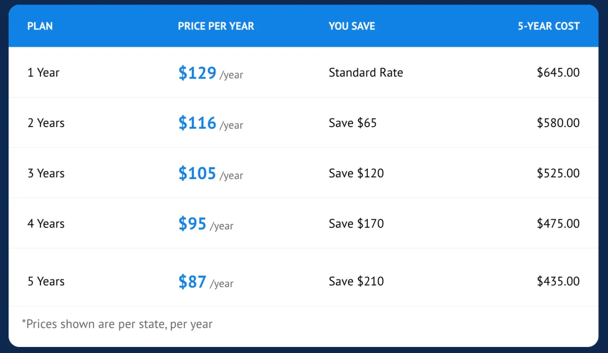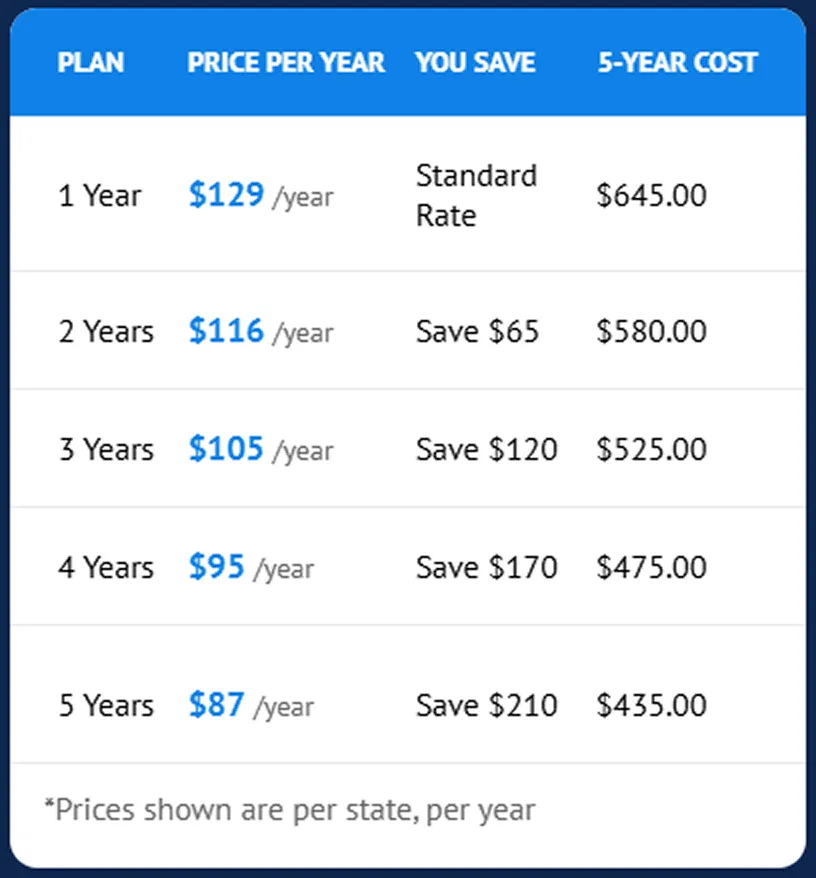 *Prices shown are per state, per year